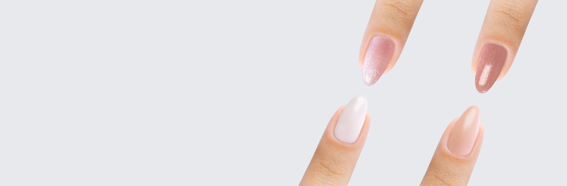 Pale pink with silver shimmer. Translucent. Semi-matte finish. Cool undertone.