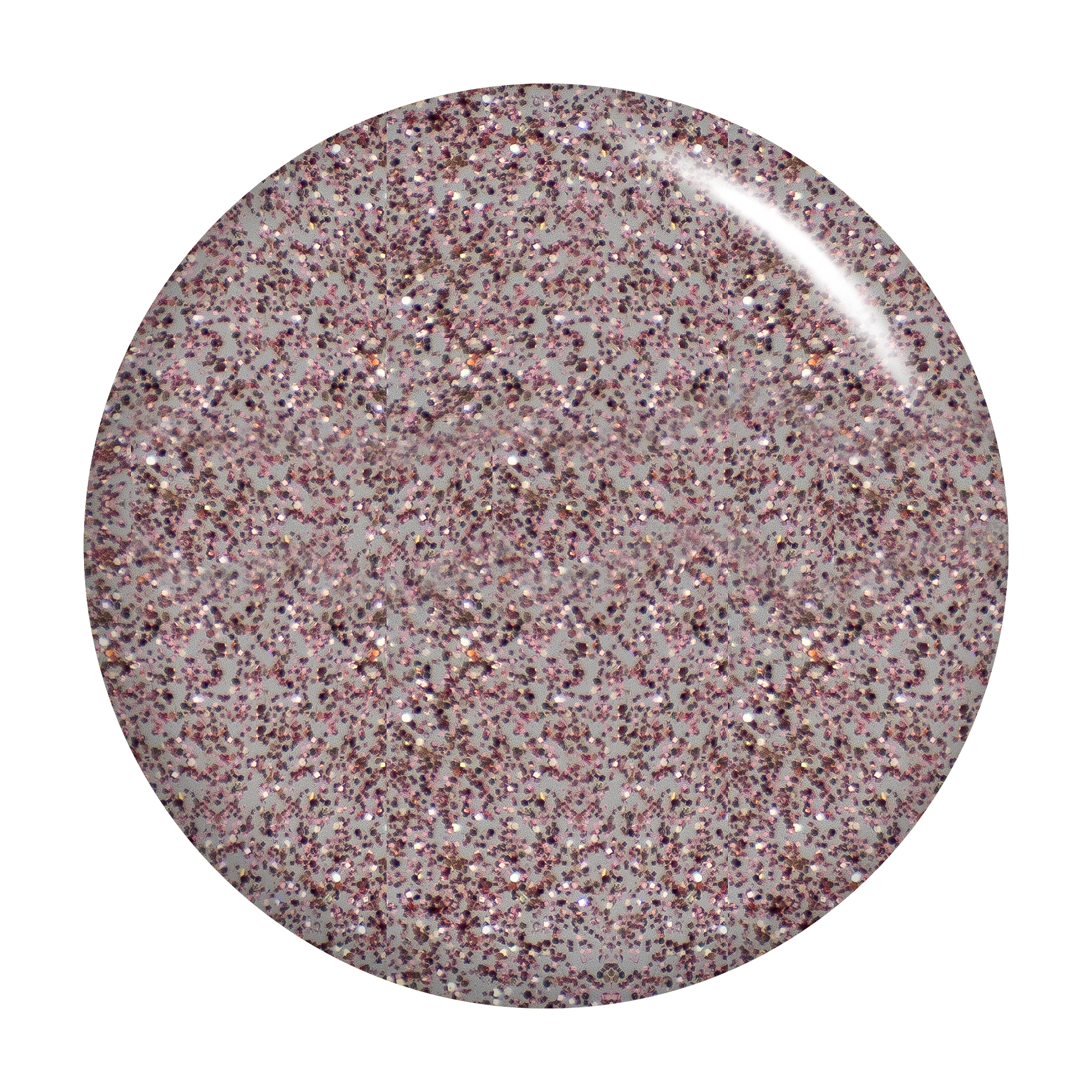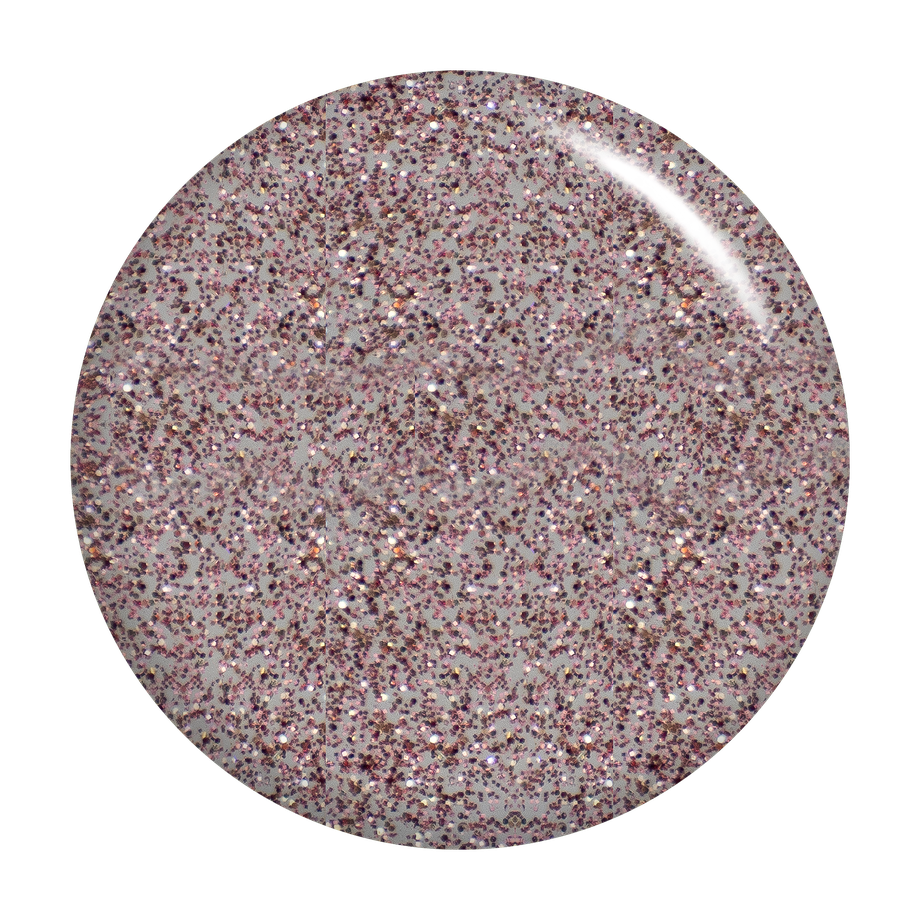 Clear coat with rose gold glitter & silver sparkles. Translucent.